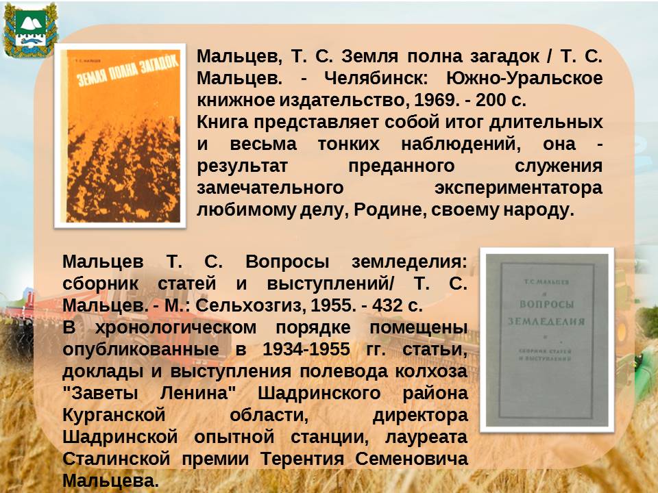 Зауралье - малая частица нашей необъятной Родины. В ряду имен, прославивших наш зауральский край, нашу страну - имя великого хлебороба Терентия Семеновича Мальцева. Для Мальцева возрождение сельского хозяйства России никогда не было только производственной проблемой. Он всегда видел за этим нечто большее – воспитание подрастающего поколения, нравственное здоровье общества, сохранение и преумножение природных богатств России. В огромной полевой лаборатории, в которую превратилась колхозная пашня, рождались нестандартные, смелые идеи. Проверенные и испытанные практикой, они со временем воплотились в знаменитую мальцевскую систему земледелия. Мишкинская межпоселенческая центральная библиотека в рамках сетевой акции представляет медиа-обзор книг Т.С.Мальцева «По родным полям, неспешным шагом», где приведены те агроприемы, принятые теперь всюду, и показано где и как зародилась новая система земледелия, которая служит благородной цели — повышению плодородия возделываемых человеком земель. Его книги «Слово о земле – кормилице», «Думы об урожае», «Раздумья о земле, о хлебе» и другие работы внесли вклад в теорию и практику отечественной агрономии. Все данные книги есть в нашей библиотеке и вы можете их прочесть.