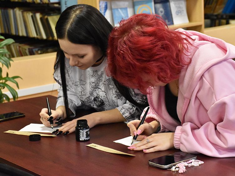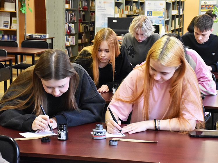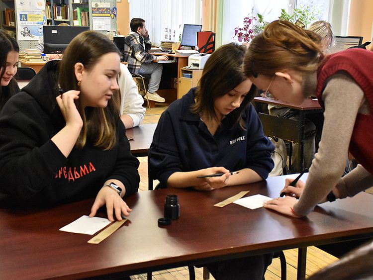 На площадке «Русская вязь» участников ждал практикум по письму пером. Студенты взяли в руки перья, поставили перед собой чернильницы и под руководством специалиста Юговки красиво выводили фразы из произведений классиков. Каждый ушел с мастер-класса с собственноручно оформленной книжной закладкой.